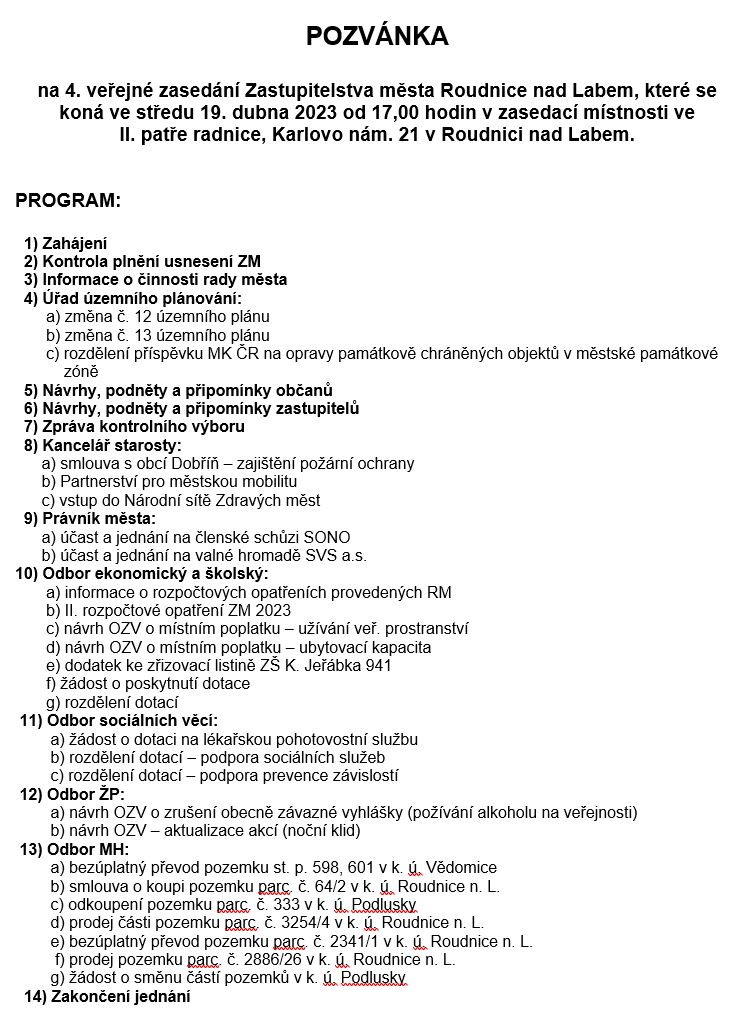 POZVÁNKA NA ZASEDÁNÍ ZASTUPITELSTVA MĚSTA ROUDNICE NAD LABEM