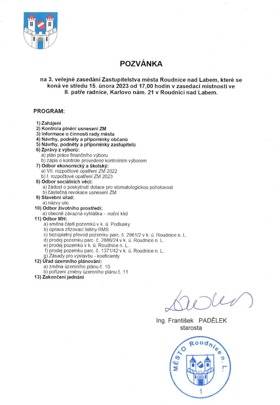 Vedení města vás zve na 3. veřejné zasedání Zastupitelstva města Roudnice nad Labem, které se koná ve středu 15. února 2023 od 17.00 hod. v zasedací místnosti ve druhém patře budovy radnice na Karlově náměstí. Jeho úplný záznam bude dostupný ve vysílání MIS a na Youtube.