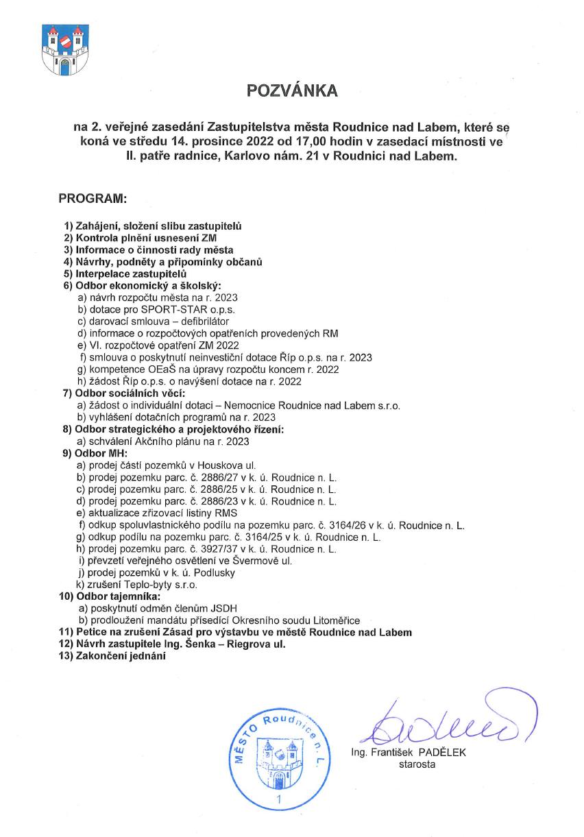 Vedení města vás zve na 2. veřejné zasedání Zastupitelstva města Roudnice nad Labem, které se koná ve středu 14. prosince 2022 od 17.00 hod. v zasedací místnosti ve druhém patře budovy radnice na Karlově náměstí. Jeho úplný záznam bude dostupný ve vysílání místní kabelové televize a na Youtube.