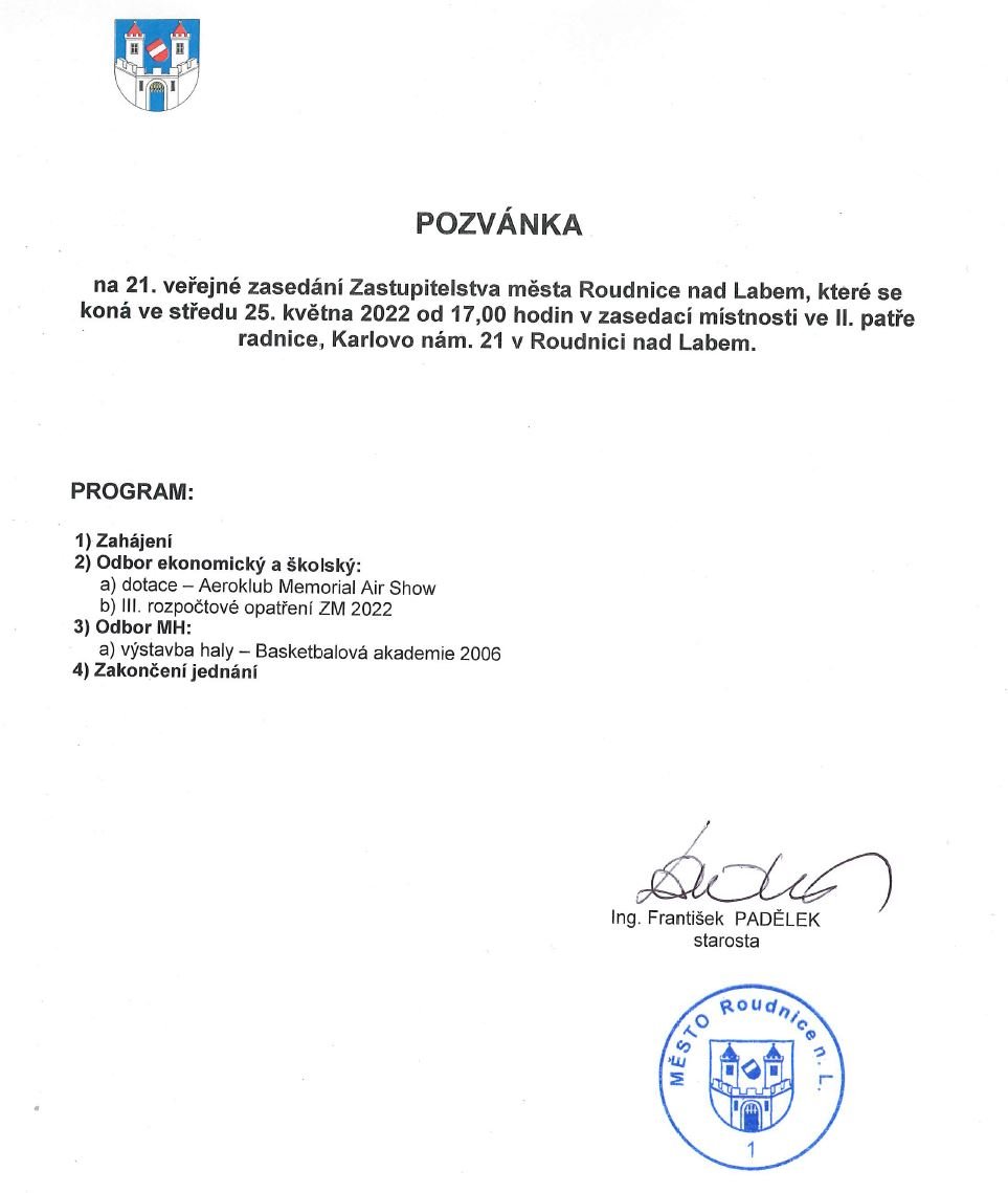 POZVÁNKA NA ZASEDÁNÍ ZASTUPITELSTVA MĚSTA ROUDNICE NAD LABEM