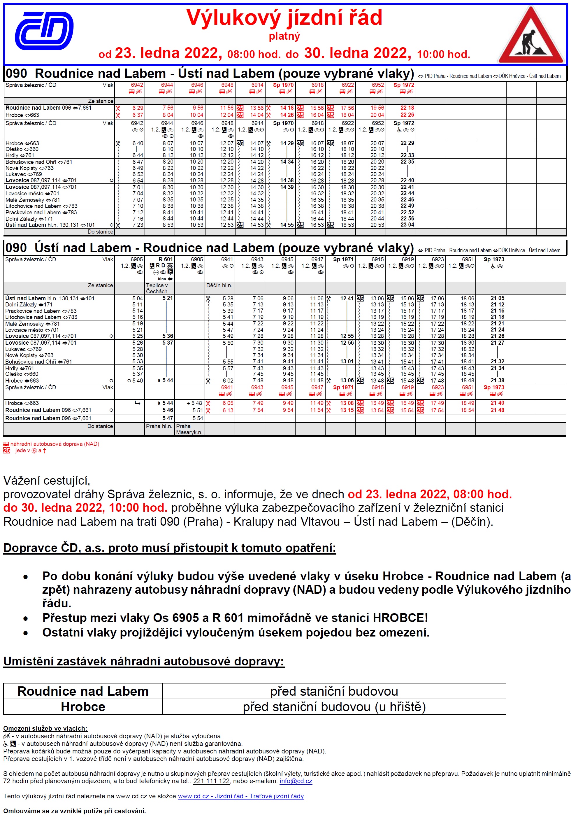· po dobu konání (23. - 30. ledna 2022) výluky budou osobní vlaky v úseku Hrobce - Roudnice nad Labem (a zpět) nahrazeny náhradní autobusovou dopravou (NAD),