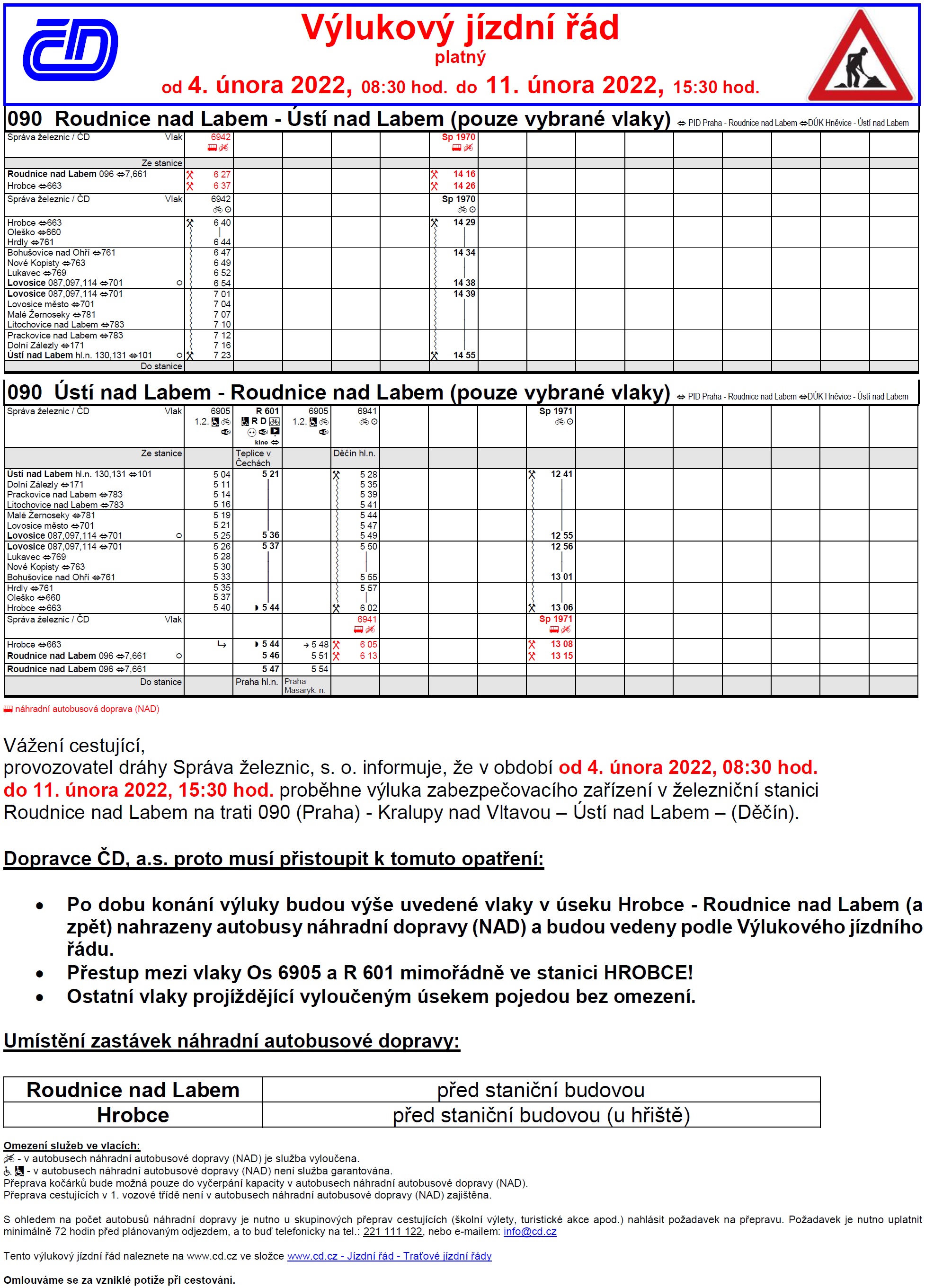 · po dobu konání (04. - 11. února 2022) výluky budou osobní vlaky v úseku Hrobce - Roudnice nad Labem (a zpět) nahrazeny náhradní autobusovou dopravou (NAD),