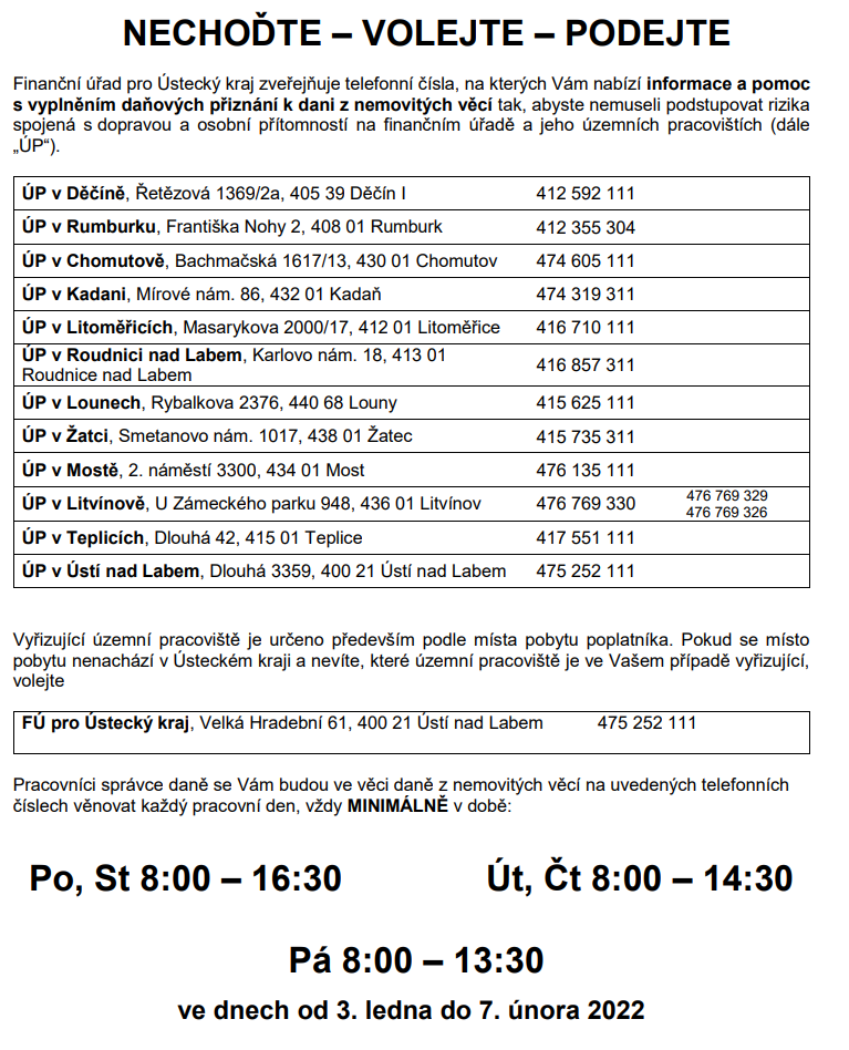 Mnozí z vás v lednu podávají daňové přiznání k dani z nemovitých věcí. Vzhledem k současné epidemiologické situaci chce Finanční úřad pro Ústecký kraj předcházet kumulaci poplatníků na podatelnách a odborných odděleních územních pracovišť. Nabízí proto alternativu prostřednictvím telefonické komunikace.