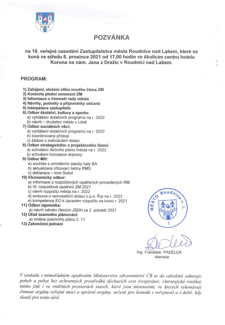 Vedení města vás zve na 18. veřejné zasedání Zastupitelstva města Roudnice nad Labem, které se, v zájmu zachování odpovídajících hygienických opatření, ve středu 8. prosince 2021 od 17.00 hod. koná v sálu školícího centra hotelu Koruna na náměstí Jana z Dražic 103. Žádáme účastníky, aby po celou dobu používali ochranu dýchacích cest, udržovali rozestupy a dbali pokynů organizátorů. Děkujeme.