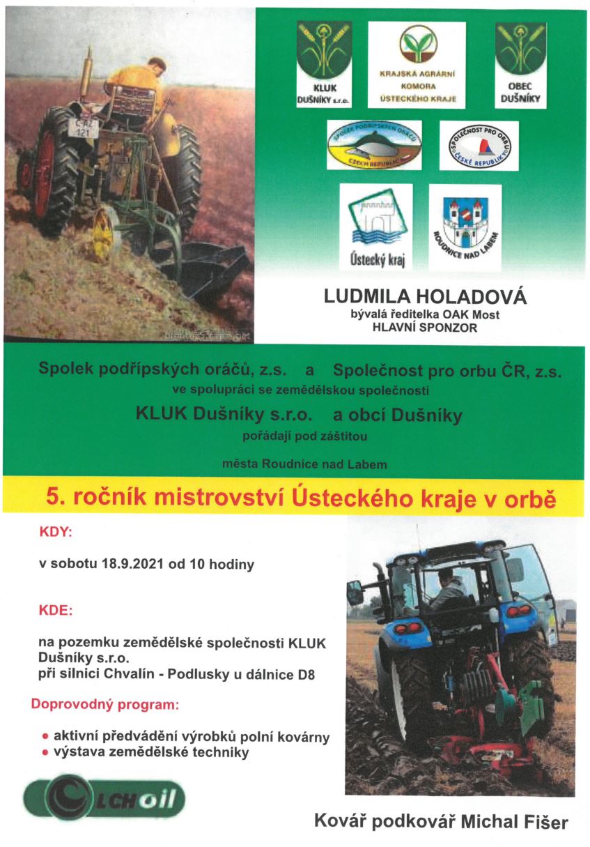 Zítra, v sobotu 18. září, proběhne 5. ročník Mistrovství Ústeckého kraje v orbě. Soutěžní den bude oficiálně zahájen v 10:00 a nejlepší oráči oceněni v 15:30. Kromě samotné orby bude k vidění i výstava zemědělské techniky a aktivně předvedeny výrobky polní kovárny.