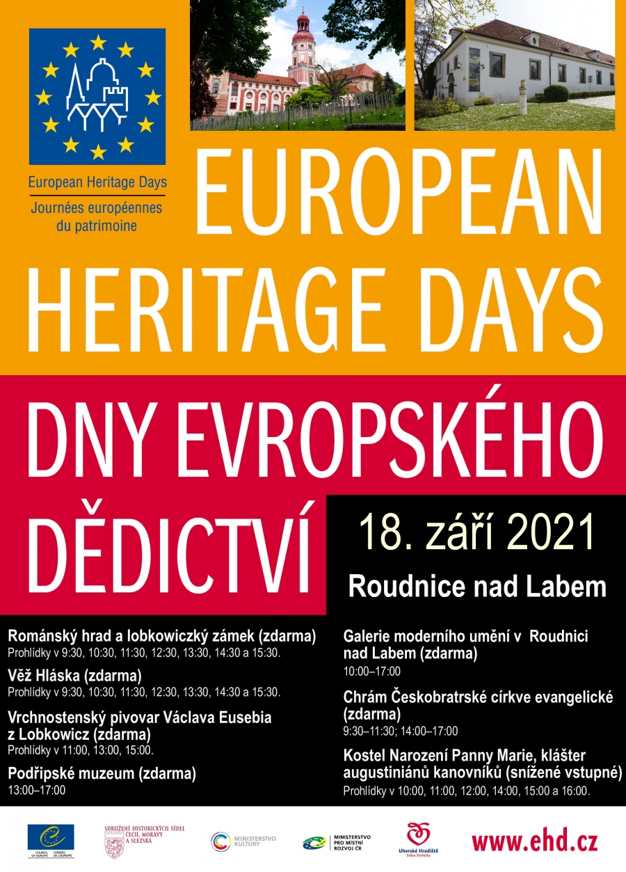 Oblíbená akce Dny evropského dědictví v Roudnici nad Labem se uskuteční v sobotu 18. září 2021. Návštěvníci opět budou mít možnost navštívit památky a objekty – zpřístupněné či veřejnosti uzavřené – a to zadarmo či za snížené vstupné.