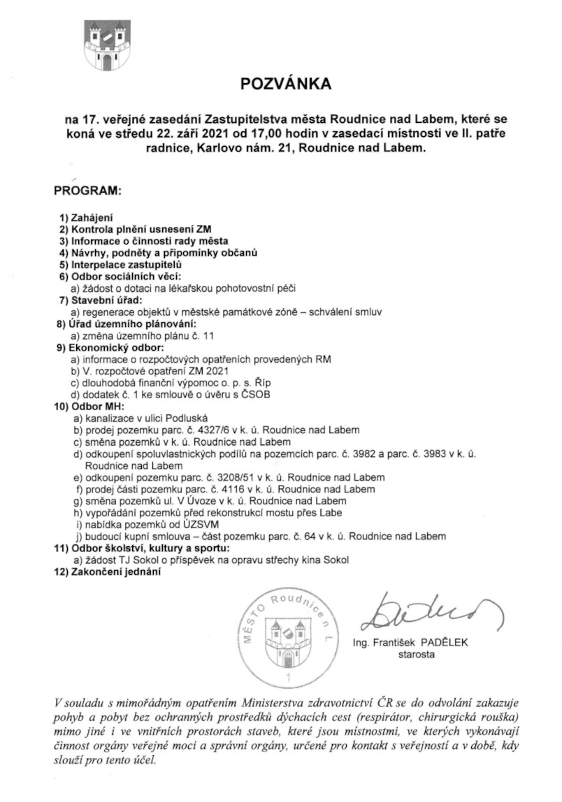 POZVÁNKA NA ZASEDÁNÍ ZASTUPITELSTVA MĚSTA ROUDNICE NAD LABEM
