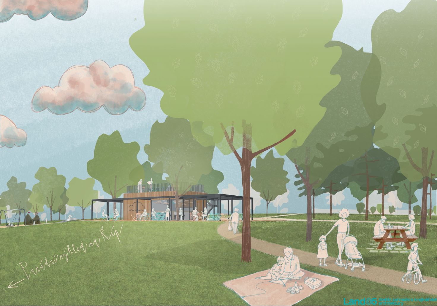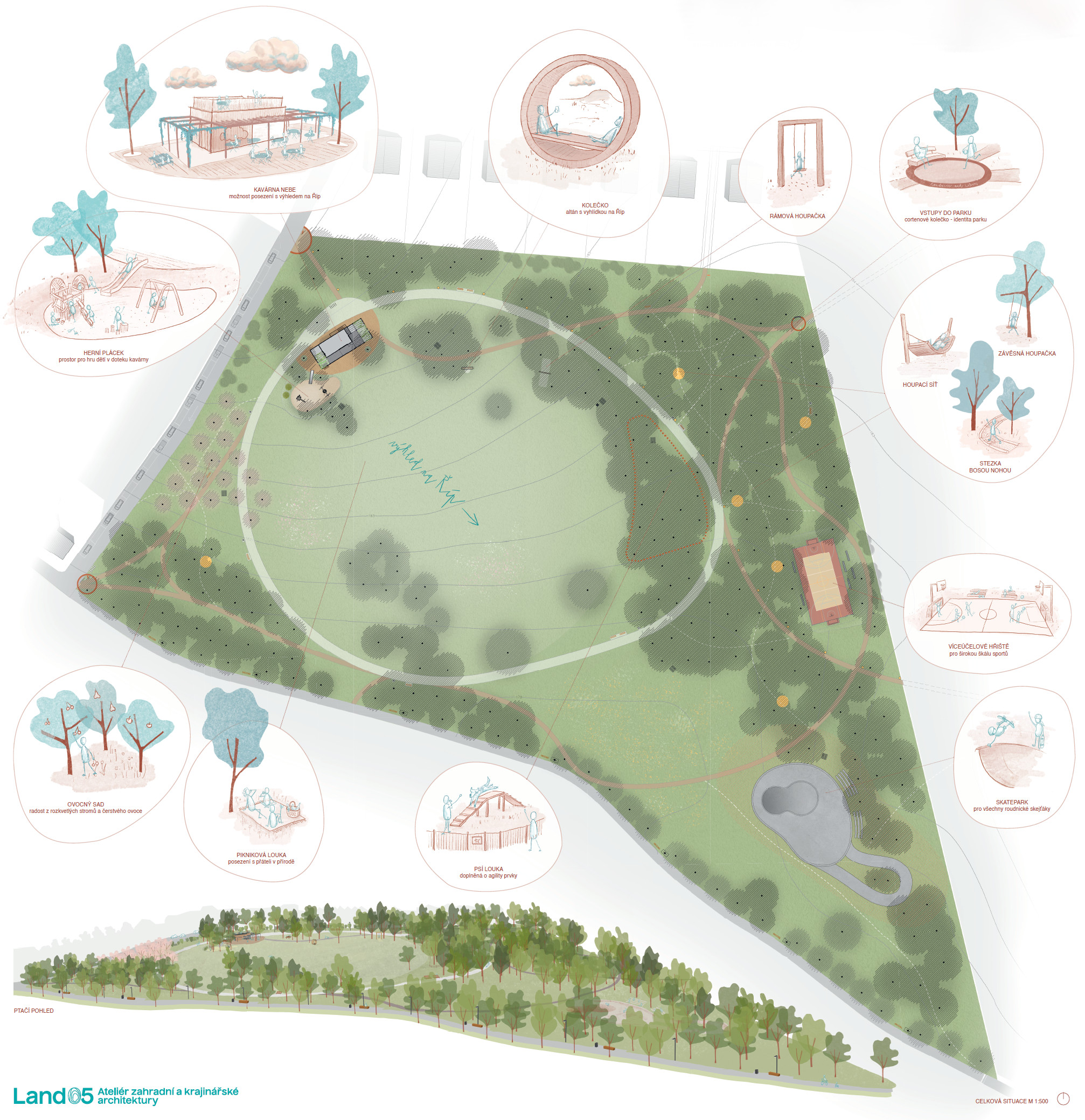 „Místní název Na Kolečku láká k propsání kolečka do půdorysu návrhu. Kolečko uvidí hlavně letci z nedalekého sportovního letiště, ale čistou travnatou plochu tohoto tvaru využijí všichni: k pikniku na louce, k pouštění draků nebo v zimě k sáňkování. Tato volná plocha nabízí mnoho možností a zároveň mezi stromy vymezuje hlavní pohled na horu Říp, který samozřejmě chceme podtrhnout. Kolečko zdůrazníme cestou, která bude vybízet k procházkám a ze které bude mít člověk stále přehled o dění v celém parku. Trasa cesty však záměrně tvar kolečka porušuje, protože se nám do návrhu propisují i oblaka roudnického malíře Otakara Nejedlého. Oblaka zaplní i nebe – strop kavárny a celkově se kavárna bude pomyslně vznášet na obláčku, nejvyšším místě parku.