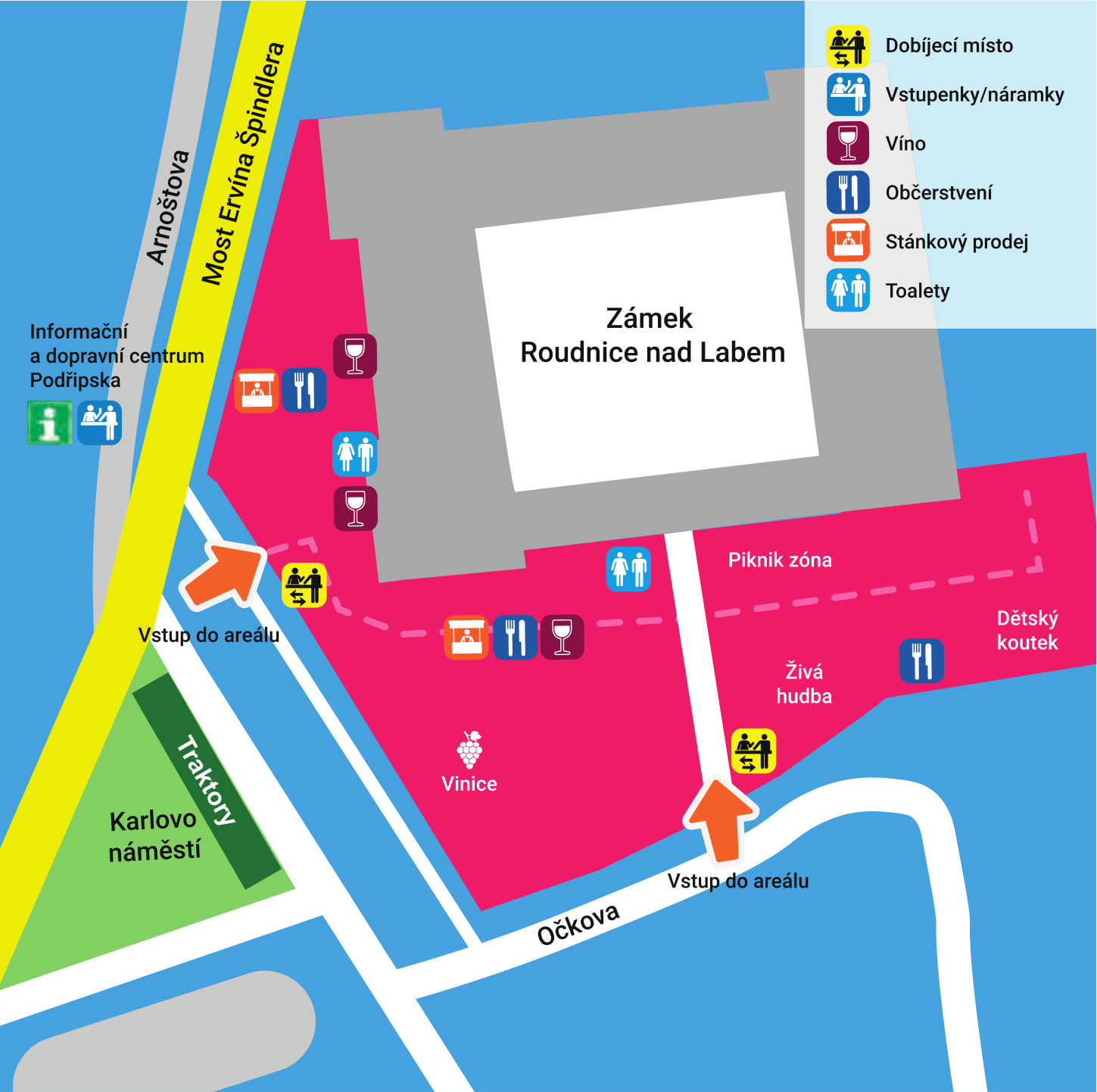 Před vstupem do areálu je nutné nejprve vyřídit základní náležitosti v Informačním a dopravním centru Podřipska (každý účastník dostane skleničku, katalog a elektronický náramek - slouží pro bezkontaktní platby). Právě tam si i v den konání akce můžete koupit vstupenku. Do pátku je však možné využít zvýhodněné ceny v předprodeji na www.roudnicky-kost.cz.