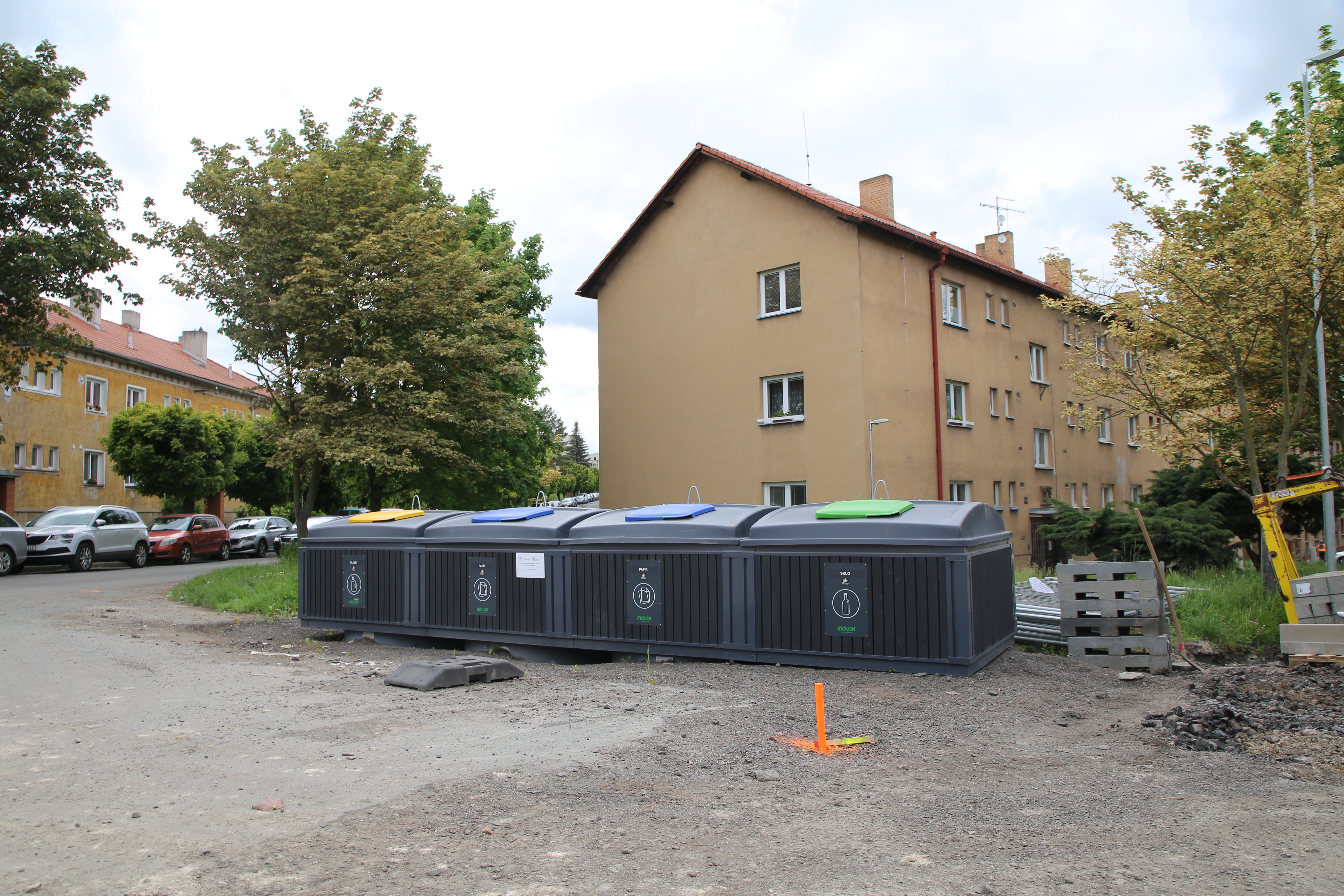 Opět byl zvolen již ověřený systém Molok. Čtveřice nádob, při vývozu vyzdvihovaná zvedacím zařízením, nabídne nadstandardní prostor pro papír (2x 5 m3), sklo (3 m3) a plast (5 m3). Konstrukce a mechanismus kontejnerů je navržena na desítky let provozu. Design zevního obalu je identický s dříve umisťovanými v Podluskách, Hracholuskách či právě realizovaným stanovištěm v Hakenově ulici. Zakázka o celkové ceně 430 810 Kč vč. DPH byla realizována firmou STRABAG, a.s. Dlažba v jejich okolí bude dokončena společně s kompletní rekonstrukcí Švermovy ulice. Tento projekt byl ze 70% spolufinancován Ústeckým krajem.