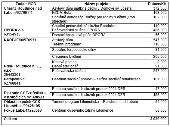 Odboru sociálních věcí bylo do dotačního programu „Podpora sociálních služeb 2021“ v termínu doručeno celkem 10 žádostí na 22 aktivit a projektů ve výši 4 855 897 Kč. V rozpočtu města Roudnice nad Labem přitom bylo na tento program alokováno 3 100 000 Kč. Zastupitelé jednohlasně odsouhlasili přidělení finanční podpory následujícím subjektům a jejich službám: