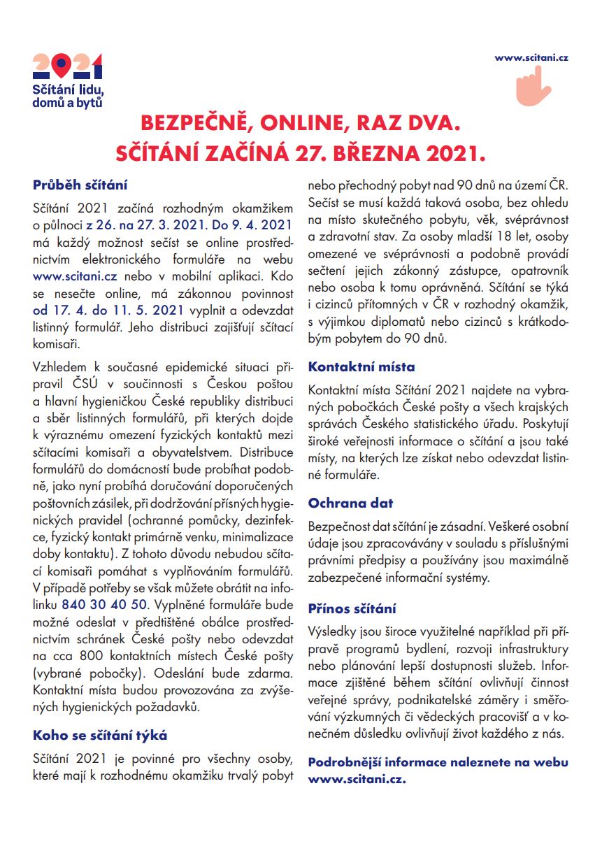 Detailní informace o letošním sčítání lidu, domů a bytů naleznete na jeho oficiálních webových stránkách scitani.cz