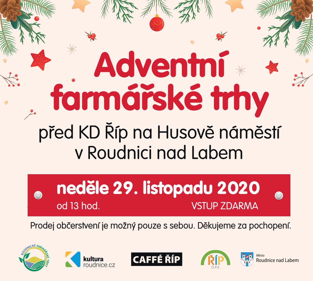 Roudnické farmářské trhy, ve spolupráci s Říp, o.p.s., pro návštěvníky připravil tradiční farmářské stánky, tentokrát rozšířené o sortiment s adventním zbožím, např. s vánočními dekoracemi a jmelím. Chybět nebude ani občerstvení, které je z důvodu vládních opatření k dispozici pouze s sebou. Výdejní okénko Caffé Říp bude dostupné bočním vchodem od věže Hláska.