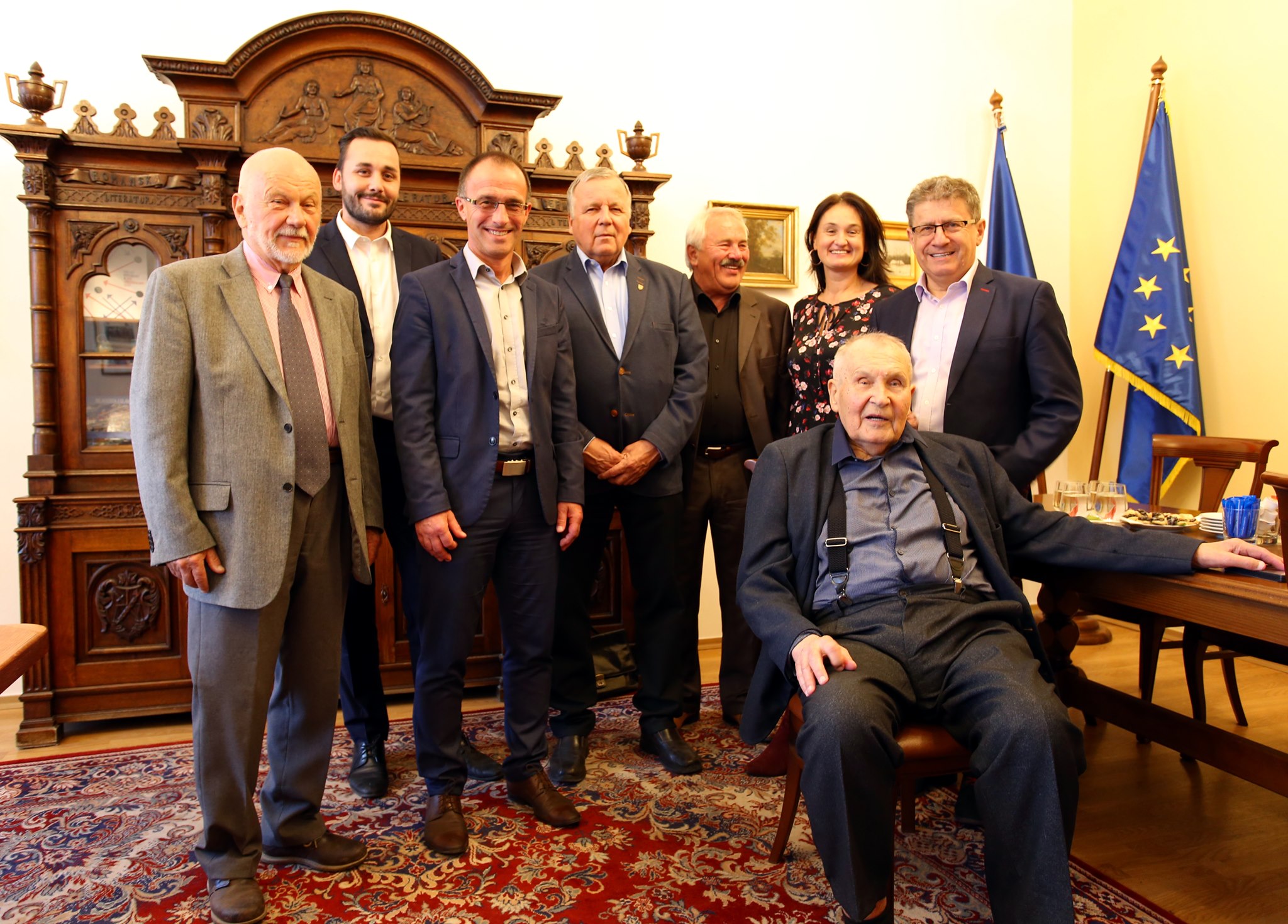 (Emeritní člen České filharmonie a čestný občan Roudnice nad Labem Jaroslav Kopáček, společně se svou dcerou Irmou Hejhalovou, zachycen při návštěvě roudnické radnice u příležitosti přání k jeho 88. narozeninám.)