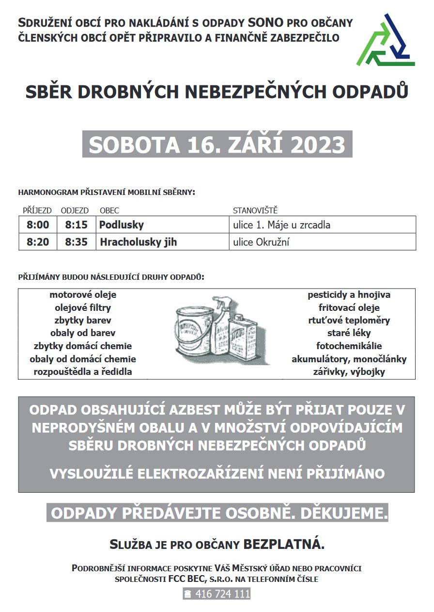 V sobotu 16. září ráno v Podluskách a na sídlišti Hracholusky JIH proběhne sběr drobných nebezpečných odpadů. Do mobilní sběrny můžete zdarma odevzdat např. motorový olej, zbytky barev či domácí chemie, staré léky či akumulátory. Televizory, monitory, lednice, mrazáky ani další domácí spotřebiče a ostatní elektrozařízení však přijímány nejsou! Službu zabezpečuje Sdružení obcí pro nakládání s odpady SONO.